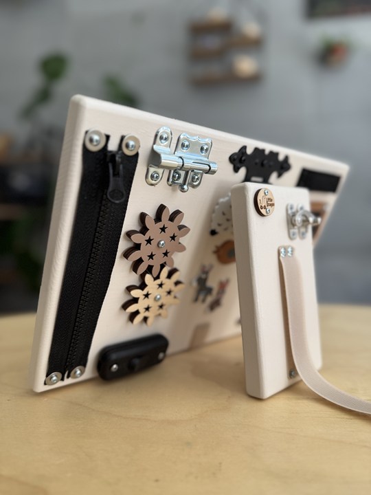 Den ene siden av nettbrettet er ikke noe annet enn en mobil manipulasjonstavle med et interessant sett med elementer. Lisser, glidelåser eller borrelås lærer barna praktiske handlinger, mens møbelrullen, glidere eller tannhjul støtter kognitive prosesser og finmotorisk utvikling.